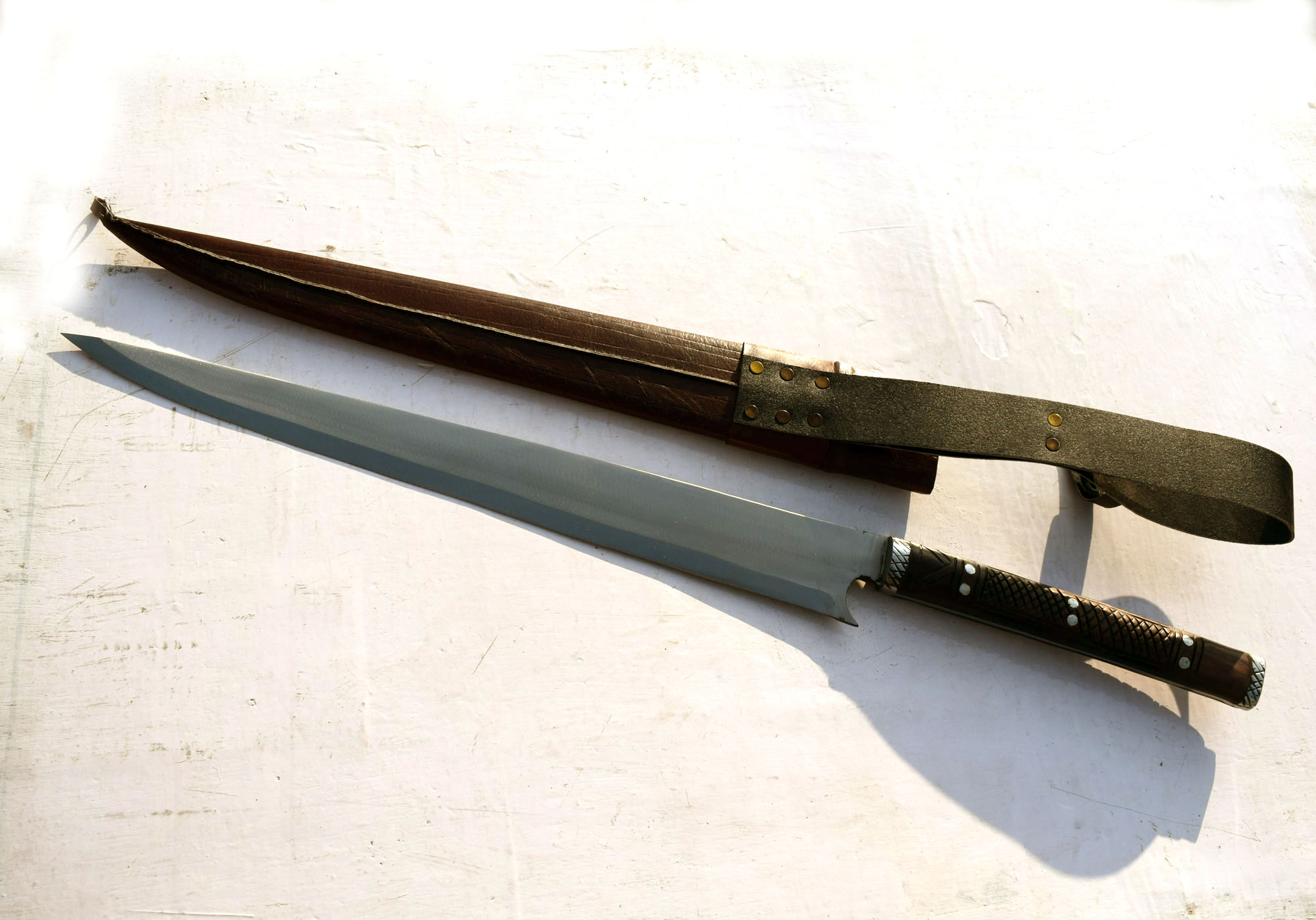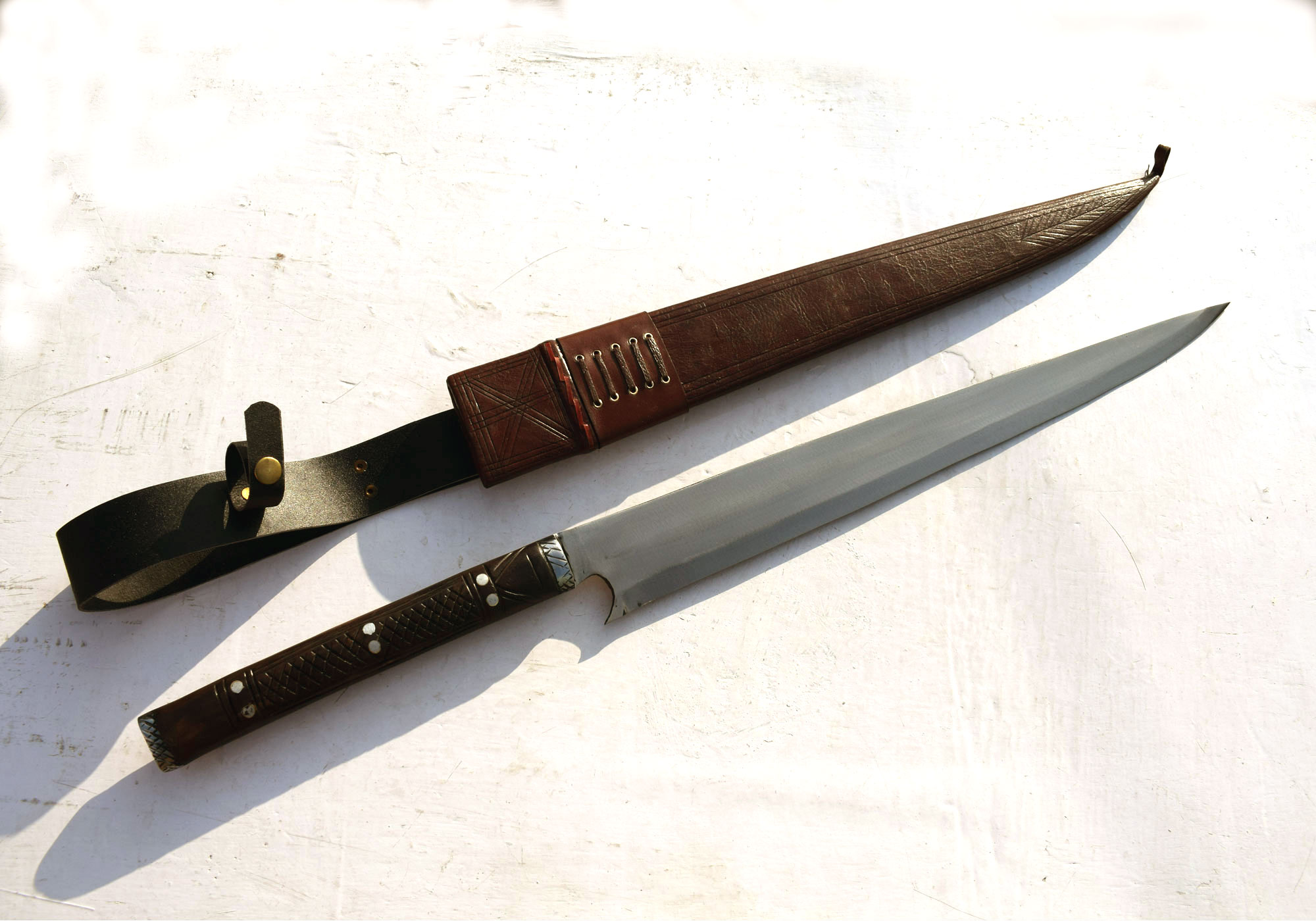 Scabbard:- Handmade from cottonwood and wrapped in genuine buffalo leather